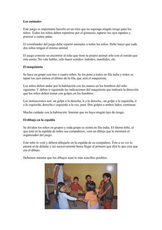 Este documento describe tres juegos para niños: 1) "Los animales", donde los niños deben encontrar a su pareja animal solo usando sonidos; 2) "El maquinista", donde un niño guía a un grupo por indicaciones táctiles; 3) "El dibujo en la espalda", donde un niño dibuja una imagen en la espalda del siguiente para adivinar el dibujo original. Todos los juegos buscan entretener a los niños de forma segura.