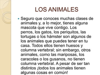 Este documento presenta información sobre los animales. Explica que los animales son seres vivos que nacen, crecen, respiran, se alimentan y se reproducen. Se dividen en tres categorías principales según su dieta: herbívoros, que solo comen plantas; carnívoros, que solo comen carne; y omnívoros, que comen tanto plantas como otros animales. Proporciona ejemplos de animales que pertenecen a cada una de estas categorías.