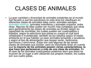 El documento clasifica a los animales en diferentes grupos como cuadrúpedos, bípedos, vertebrados, invertebrados, terrestres, acuáticos y según su alimentación. También habla sobre animales en peligro de extinción debido a la caza, destrucción de hábitat y cautiverio. La extinción de especies rompe el equilibrio ecológico y afecta a los seres humanos que forman parte de la naturaleza.