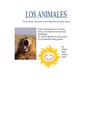 En las selvas africanas viven muchos animales incluyendo leones, que son conocidos como el rey de la selva. El león es un mamífero grande que vive en la selva y otros lugares de África, donde hace mucho calor.