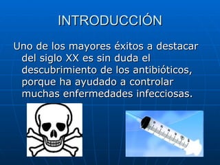 El documento habla sobre los antibióticos. Explica que los antibióticos son medicamentos que atacan a las bacterias y detienen las enfermedades que causan. También menciona que los antibióticos solo deben tomarse cuando un médico lo indique, en la dosis correcta y durante el tiempo completo prescrito para curar la infección. Además, advierte que no se debe guardar antibióticos sobrantes para usos futuros.