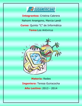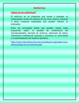 Este documento proporciona información sobre antivirus, incluyendo una definición de antivirus, una lista de los antivirus más famosos y una discusión de los diez mejores antivirus. Explica que un antivirus es un programa que ayuda a proteger una computadora contra virus, gusanos y otros programas maliciosos mediante la detección y eliminación de estos. También proporciona instrucciones paso a paso para instalar el antivirus Avast gratuito.