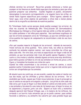 Los arrieros eran personas que transportaban mercancías y productos en animales de carga entre pueblos antes de que se construyeran las carreteras. Traían novedades a los pueblos y eran un espectáculo para los niños. Acampaban a las orillas de los pueblos y sus rutas más comunes incluían Yalalag, Totontepec y Choapan. Ahora han sido reemplazados por camiones, pero los niños ya no ven las grandes recuas de animales trotar por los caminos.