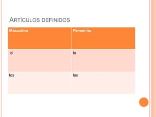 El documento describe los diferentes tipos de artículos en español, incluyendo artículos definidos, indefinidos y contrastivos. Explica las formas masculinas y femeninas de cada artículo y proporciona ejemplos de su uso en oraciones cortas para ilustrar las reglas gramaticales de los artículos.