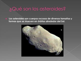 Los asteroides son cuerpos rocosos que orbitan alrededor del Sol y forman parte de dos cinturones principales: el cinturón de asteroides entre Marte y Júpiter, y el cinturón de Kuiper más allá de Neptuno. Vistos desde la Tierra, los asteroides parecen estrellas debido a su tamaño pequeño en relación a su distancia, y reciben su nombre de esa apariencia. El más grande es Ceres con 1000 km de diámetro.