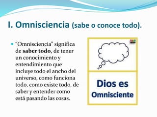 Este documento describe las tres cualidades de Dios como omnisciente, omnipotente y omnipresente. Primero, explica que Dios es omnisciente y sabe todo lo pasado, presente y futuro. Segundo, describe a Dios como omnipotente y capaz de hacer cualquier cosa, aunque está limitado por su propia naturaleza moral. Tercero, explica que Dios es omnipresente y está presente en todo lugar al mismo tiempo, de modo que no hay lugar donde los seres humanos puedan esconderse de él.