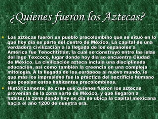 Los aztecas fueron un pueblo precolombino que habitó el centro de México y construyó la gran ciudad de Tenochtitlán. Creían en varios dioses y practicaban el sacrificio humano. Su imperio terminó cuando fueron conquistados por los españoles en el siglo XVI, ejecutando al último rey azteca Cuauhtémoc.