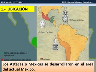 Los aztecas se desarrollaron en el área de México actual y crearon un gran imperio con capital en Tenochtitlan. Su economía se basaba en la agricultura mediante el uso de chinampas y trajineras, y tenían redes comerciales que abarcaban todo el imperio. Su religión politeísta estaba dominada por dioses como Huitzilopochtli y Quetzalcóatl, y realizaban sacrificios humanos como ofrenda a los dioses. Construyeron templos, palacios y santuarios de piedra, como pirá