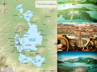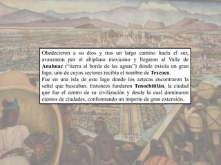 Los aztecas eran originarios de Aztlán y siguiendo las órdenes de su dios Huitzilopochtli, fundaron la ciudad de Tenochtitlán en una isla del lago Texcoco, donde crearon un sistema de canales. Desde allí, los aztecas construyeron un gran imperio a través de conquistas y alianzas, con Tenochtitlán como su centro político, cultural y económico.