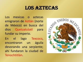 Los mexicas o aztecas emigraron de Aztlán en busca de su dios Quetzalcóatl y fundaron la ciudad de Tenochtitlán en el lago Texcoco después de ver un águila devorando una serpiente. Tenían una sociedad estratificada y teocrática gobernada por un emperador divino y sacerdotes poderosos. Practicaban sacrificios humanos como ofrenda a sus dioses y tuvieron un floreciente imperio basado en la agricultura, el comercio y la tributación.