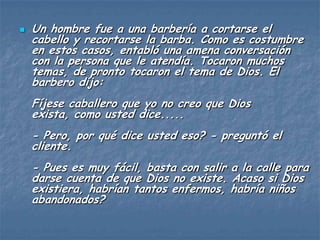 El documento cuenta la historia de un cliente que visita una barbería. El barbero expresa su creencia de que Dios no existe debido al sufrimiento en el mundo. El cliente se da cuenta de un hombre con el pelo y la barba largos en la calle, y le dice al barbero que los barberos tampoco existen usando la misma lógica. El cliente explica que así como ese hombre no visita al barbero, las personas no buscan a Dios, a pesar de su existencia.