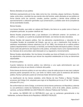 El documento clasifica los bienes del estado en bienes de uso público, que pertenecen a la comunidad y son destinados al uso general, y bienes fiscales, que son administrados por el estado para sus propios fines. Se establece que los bienes de uso público son inalienables, imprescriptibles e inembargables, mientras que los bienes fiscales pueden ser utilizados por el estado de manera privativa. La distinción entre ambos tipos de bienes se basa en su titularidad, uso y la normativa que los regula.