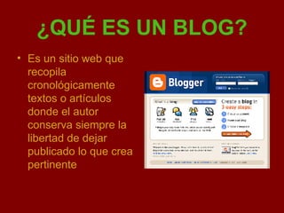 Un blog es un sitio web que publica artículos y textos de forma cronológica sobre temas variados bajo la libertad editorial de su autor. Los blogs sirven para compartir conocimientos e ideas, dejar constancia de recuerdos y comentar noticias con objetivos como difundir información, expresar opiniones y entretener a otros lectores, diferenciándose de un álbum en que este se enfoca más en fotos mientras los blogs lo hacen en texto y presentación similar a un diario.