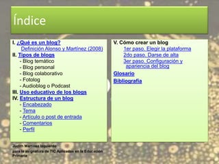 El documento proporciona una introducción a los blogs, definiéndolos como páginas web personales donde se publican periódicamente contenidos variados. Detalla cómo crear un blog en tres pasos: elegir una plataforma, registrarse y configurar la apariencia. Además, enfatiza el uso educativo de los blogs y describe su estructura básica, que incluye encabezado, temas, entradas y comentarios.