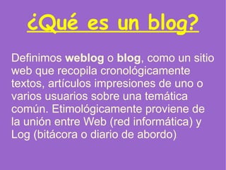 Un blog es un sitio web que recopila artículos cronológicamente sobre una temática común. Para crear un blog basta con registrarse en una página de alojamiento gratuito y elegir un nombre, luego confirmar la dirección de correo electrónico. Una vez creado, mantener un blog consiste simplemente en publicar nuevos artículos periódicamente, y los comentarios de los lectores pueden formar una comunidad en torno al blog.