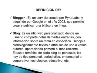 Este documento define blogs y bloggers, y resume la historia y características principales de los blogs. Explica que los primeros blogs aparecieron en la década de 1990 y que plataformas como Blogger y LiveJournal se hicieron populares a principios de la década de 2000. También describe las principales herramientas para crear y administrar blogs de manera sencilla.