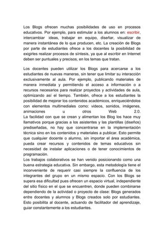 Este documento describe las muchas posibilidades educativas que ofrecen los blogs, incluyendo estimular a los estudiantes a escribir, intercambiar ideas y trabajar en equipo, y permitir que los profesores se comuniquen con los estudiantes de manera más inmediata y compartan recursos. Los blogs también permiten a los estudiantes mejorar los contenidos académicos con elementos multimedia y trabajar en proyectos de manera colaborativa a pesar de la distancia física. Finalmente, los blogs pueden usarse para comunicar información a toda la