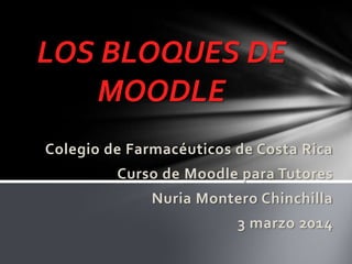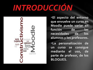 El documento describe los bloques de Moodle, herramientas que permiten personalizar cursos agregando funcionalidades. Explica que los bloques aparecen a los lados de la pantalla y ofrecen información y acceso a herramientas. Algunos bloques comunes incluyen navegación, ajustes, búsqueda en foros y calendario. Los bloques permiten almacenar, comunicar, colaborar y evaluar en los cursos.