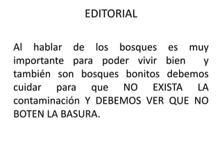 El documento habla sobre la importancia de cuidar y proteger los bosques. Menciona que los bosques son hábitats importantes para los animales y juegan un papel clave en el ciclo del carbono. También destaca la diversidad de bosques en el Ecuador y en todo el mundo, y la importancia de gestionarlos de manera sostenible.