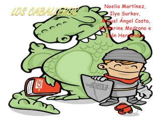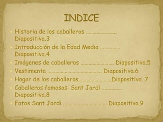 Este documento presenta información sobre la historia y cultura de los caballeros en la Edad Media. Explica que los caballeros surgieron como un cuerpo militar importante en Francia a finales del siglo X y ganaron poder político debido a su entrenamiento militar y riqueza. Describe aspectos como su vestimenta, armadura y armas típicas, así como que algunos vivían en feudos mientras otros eran errantes. Finalmente, resume la leyenda de San Jorge y el Dragón, que es la base de la tradición del Día de Sant J