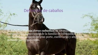 Este documento describe diferentes tipos de caballos, incluyendo el caballo Frisian originario de los Países Bajos conocido por su crin larga y abundante, el caballo Andaluz originario de España considerado una de las razas equinas más antiguas, el caballo Azteca obtenido a través de la combinación de tres razas incluyendo el caballo ibérico y el caballo cuarto de milla desarrollado en los Estados Unidos para carreras cortas de 402 metros.