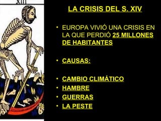 Europa sufrió una crisis en el siglo XIV que causó 25 millones de muertes debido a cambios climáticos, hambrunas, guerras y la peste bubónica. La peste se extendió desde Asia a Europa matando a la mitad de la población europea. Los reyes católicos unieron a Castilla y Aragón a través del matrimonio y establecieron una monarquía autoritaria, conquistaron Granada y expandieron su imperio a América y el norte de África.