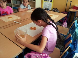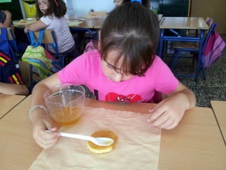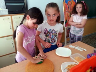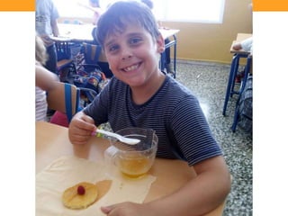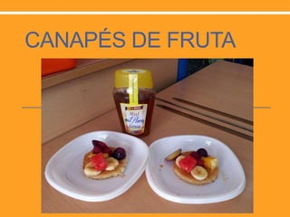 Este documento presenta una receta para preparar canapés de fruta. La receta incluye cortar trozos de varias frutas como plátanos, manzanas, ciruelas, uvas, peras y naranjas y empapar círculos de bizcocho en zumo de limón y miel antes de montar los canapés con la fruta cortada.