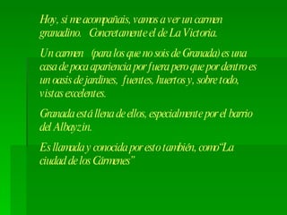 Este documento presenta un recorrido por un carmen típico de Granada, llamado el Carmen de La Victoria. Describe las características de los cármenes granadinos, como casas modestas por fuera pero con jardines y vistas espectaculares del interior. Luego detalla la ruta para llegar a este carmen en particular, pasando por lugares emblemáticos como la Plaza Nueva, la iglesia de Santa Ana y el Museo Arqueológico. Finalmente, muestra las maravillosas vistas de la Alhambra que se