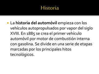 El documento resume los tipos de automóviles, incluyendo turismo, camioneta y deportivo, y describe los dos tipos de motores, térmico y eléctrico. También menciona que los países ofrecen incentivos para que los propietarios cambien sus vehículos antiguos por modelos más nuevos y menos contaminantes.