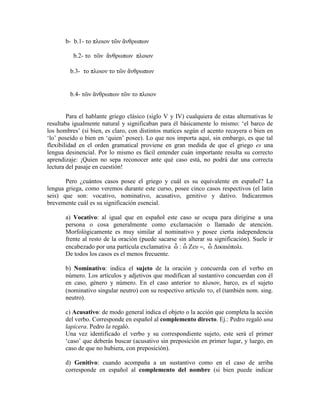 Este documento presenta una introducción a los casos gramaticales en griego antiguo. Explica que el griego usa sufijos variables ("desinencias") en sustantivos, adjetivos y pronombres para indicar su función dentro de una oración, a diferencia del español que depende más del orden de palabras. Describe los cinco casos del griego (vocativo, nominativo, acusativo, genitivo y dativo) y su equivalencia aproximada en español. Resalta que los casos pueden tener diferentes significados dependiendo del verbo o preposición con el que se usen