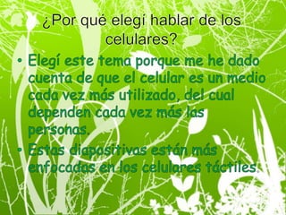 El documento habla sobre la historia y evolución de los celulares, desde su origen en 1947 hasta los modelos táctiles más populares de 2010. Explica cómo surgieron los primeros conceptos de comunicaciones móviles y teléfonos, con el DynaTAC 8000X siendo el primer celular comercial en 1973. También describe cinco funciones básicas de los celulares modernos y proporciona detalles sobre populares modelos táctiles de 2010 como el iPhone 3GS, Nokia 5800, HTC G1 y varios de Samsung.