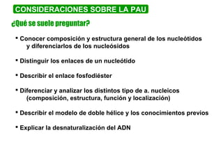 El documento describe los ácidos nucleicos y el ADN. Explica que los ácidos nucleicos son polímeros formados por nucleótidos compuestos de una pentosa, fosfato e base nitrogenada. El ADN tiene una estructura primaria de nucleótidos y una secundaria de doble hélice unida por puentes de hidrógeno entre las bases. En las células, el ADN se empaqueta en niveles crecientes de organización asociándose a proteínas como las histonas.