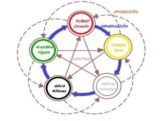 Este documento presenta una introducción a la teoría de los cinco elementos de la medicina tradicional china. Explica que la naturaleza está compuesta por cinco sustancias (madera, fuego, tierra, metal y agua) y cómo estos elementos se relacionan con las estaciones, climas, colores, sabores y órganos del cuerpo humano. También describe los ciclos generador y de control que gobiernan las interacciones entre los cinco elementos.
