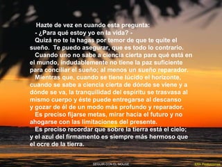 Este documento ofrece reflexiones sobre cómo encontrar la paz, la alegría y el propósito a través de vivir de acuerdo con la voluntad de Dios. Señala que la paz verdadera viene de saber que se está cumpliendo la voluntad de Dios, y que alejarse de Dios aleja de la fuente de la alegría y la paz. También enfatiza la importancia del orden en la vida y en reflejar el orden que Dios puso en la creación.