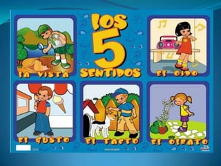 El documento describe los cinco sentidos humanos (vista, oído, olfato, tacto y gusto) y sus funciones correspondientes. La vista permite ver, el oído escuchar, el olfato oler, el tacto sentir lo que tocamos y el gusto degustar los alimentos. Los sentidos son fundamentales para que los seres humanos conozcamos y nos relacionemos con el mundo que nos rodea.