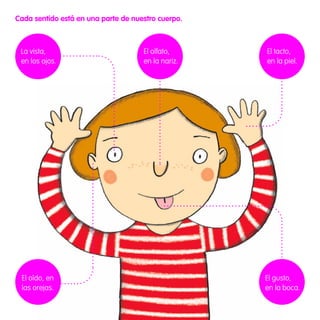El documento habla sobre los cinco sentidos humanos (vista, olfato, tacto, oído y gusto) y cómo cada uno se encuentra en una parte diferente del cuerpo. Explica que los sentidos nos ayudan a conocer el mundo que nos rodea y a disfrutar de él. También menciona algunas profesiones relacionadas con los sentidos y cómo artistas se han inspirado en ellos.