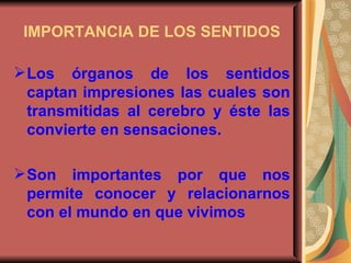 Los seres humanos tienen cinco sentidos - vista, oído, olfato, gusto y tacto - que les permiten conocer y relacionarse con el mundo. Cada sentido está asociado con un órgano específico, como los ojos para la vista y la lengua para el gusto. Los sentidos captan impresiones del entorno y las transmiten al cerebro para que las interprete como sensaciones, lo que nos permite percibir características como la forma, tamaño, distancia, sonidos, olores y sabores.