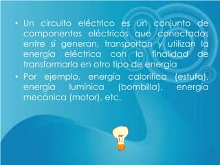 Este documento describe los componentes básicos de un circuito eléctrico, incluyendo generadores, conductores, receptores y elementos de control. También clasifica los circuitos eléctricos según el tipo de señal (continua, alterna, mixta), régimen (periódico, transitorio, permanente) y configuración (serie, paralelo, mixta). Finalmente, señala que los ingenieros eléctricos deben predecir tensiones y corrientes en un circuito para su diseño.