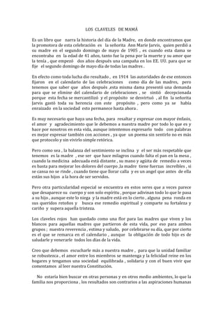 El documento describe la historia del Día de la Madre, establecido por Ann Jarvis en honor a su madre fallecida. Aunque Jarvis más tarde se decepcionó por la mercantilización de la fecha, la celebración se ha mantenido como una forma de expresar el amor y gratitud hacia las madres. El documento también enfatiza el papel crucial de las madres en la familia y sociedad, y la importancia de escucharlas y fortalecer las unidades familiares.