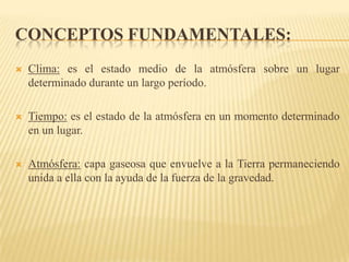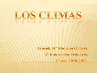 Este documento describe los diferentes tipos de climas alrededor del mundo, incluyendo climas cálidos como el ecuatorial, tropical con estación seca y desértico tropical, climas templados como el mediterráneo, oceánico y continental, y climas fríos como los polares y de alta montaña. Define los elementos clave de cada clima como su ubicación, precipitaciones, temperaturas, vegetación y fauna características.