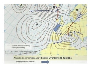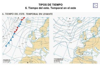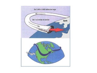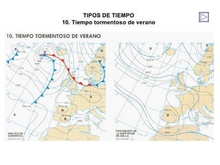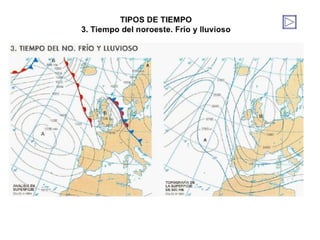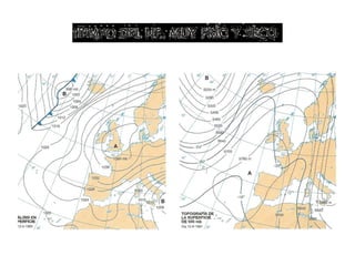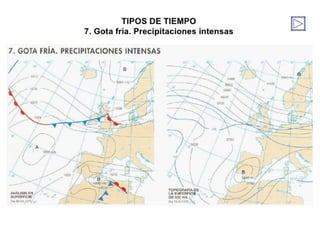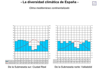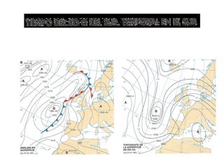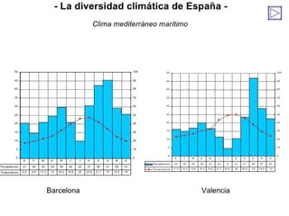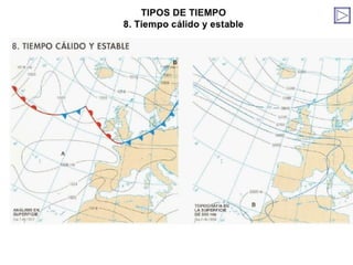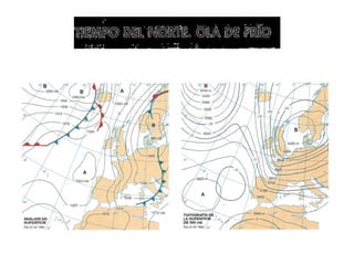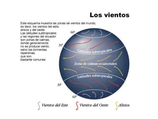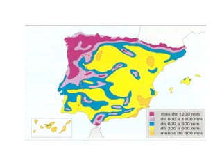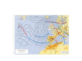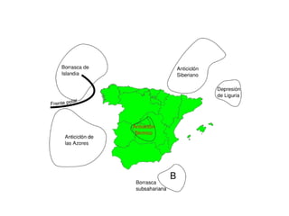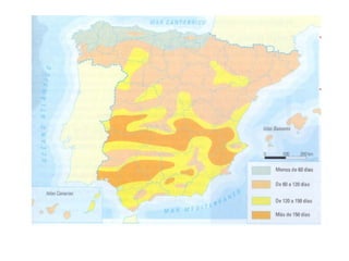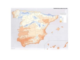 El documento describe los factores climáticos de España. Los factores geográficos como la latitud, situación, influencia del mar y relieve afectan elementos como la temperatura y precipitación. Los factores termodinámicos como la corriente en chorro y las masas de aire también influyen el clima creando sistemas de alta y baja presión y frentes que generan el tiempo. El documento explica la circulación atmosférica y sus efectos sobre el clima diverso de España.