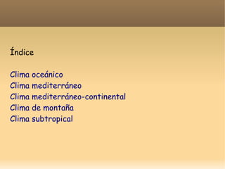España tiene cinco tipos principales de clima: clima oceánico, caracterizado por temperaturas suaves y lluvias constantes a lo largo del año; clima mediterráneo, con inviernos suaves y veranos cálidos y secos; clima mediterráneo-continental, con inviernos fríos y veranos calurosos y poca lluvia; clima de montaña, con temperaturas bajas en invierno y veranos suaves, y abundantes precipitaciones en forma de nieve; y clima subtropical en Can