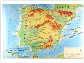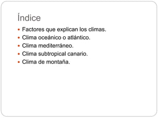 Este documento describe los principales climas de España, incluyendo el clima oceánico, mediterráneo, subtropical canario y de montaña. Explica los factores que influyen en el clima como la latitud, altitud, distancia al mar y circulación atmosférica. Luego proporciona detalles sobre las características térmicas y pluviométricas de cada clima.