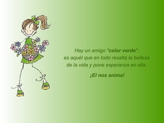 El documento describe los diferentes tipos de amigos y las cualidades que representan diferentes colores. Describe amigos verdes que traen esperanza, amigos azules que traen paz y serenidad, amigos amarillos que traen alegría y risa, amigos rojos apasionados, amigos naranjas que fortalecen con energía, amigos grises que enseñan el silencio y la reflexión, amigos violetas nobles y sabios, amigos negros que dicen la verdad directamente, y amigos blancos que comparten conocimientos aprendidos. En conjunto, los amigos representan un arco