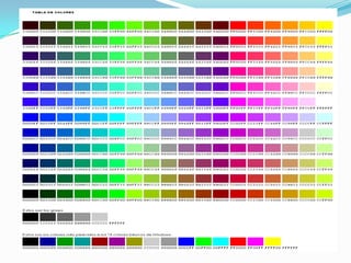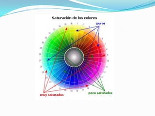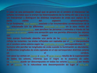 El documento describe los conceptos fundamentales relacionados con los colores. Explica que el color es una percepción visual que se genera en el cerebro al interpretar las señales de la luz captadas por la retina. Todo objeto iluminado absorbe y refleja longitudes de onda de luz de manera selectiva, y son esas ondas reflejadas las que son interpretadas por el cerebro como diferentes colores. También introduce los conceptos de pigmentos, tintes, síntesis aditiva y sustractiva de colores, y el círculo cromático.