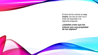 Los colores dependen de tres factores: la fuente de luz, el objeto, y nuestros ojos. La luz emitida por el sol contiene ondas electromagnéticas de diferentes frecuencias, de las cuales solo podemos ver una pequeña parte. Los colores que vemos en los objetos dependen de qué ondas electromagnéticas son absorbidas y reflejadas por su composición química. Por lo tanto, los colores no son una propiedad inherente de los objetos, sino un efecto óptico que depende de la interacción entre la luz y