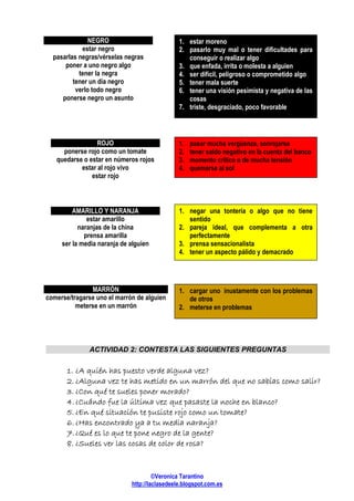 Este documento presenta una actividad sobre colores en español. Incluye una tabla para emparejar expresiones con colores con sus definiciones correspondientes. También incluye preguntas sobre preferencias de colores entre hombres y mujeres según un estudio, así como actividades para leer colores en lugar de palabras y completar tablas con cosas de diferentes colores.