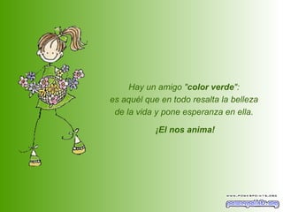 El documento describe diferentes tipos de amigos en términos de colores, asignando características y cualidades a cada color. Menciona amigos de color verde, azul, amarillo, rojo, naranja, gris, violeta, negro y blanco, y cómo cada uno aporta algo diferente como la esperanza, la paz, la alegría, la pasión, la energía, la sabiduría, la majestuosidad, la verdad y las enseñanzas, respectivamente. Concluye diciendo que cuando todos los amigos se reúnen representan un