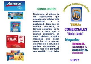 Los comerciales son anuncios publicitarios creados para dar a conocer productos, hechos o eventos a las personas. Forman parte integral de las empresas ya que promueven artículos y servicios de manera convincente a través de medios de comunicación como la televisión, la radio y las revistas. Los comerciales siguen un proceso de preparación que incluye generar ideas y seguir pautas para comunicar el mensaje de manera efectiva con el objetivo máximo de que las personas compren el producto anunciado.