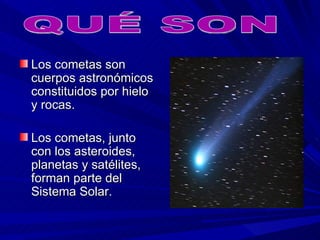 Los cometas son cuerpos astronómicos compuestos principalmente de hielo y rocas que provienen de la Nube de Oort y el Cinturón de Kuiper. Están formados por agua, hielo seco, amoníaco y otros gases, y su cola está compuesta de polvo y su coma de gas ionizado. Algunos de los cometas más famosos son el Halley, Encke y Hale-Bopp.
